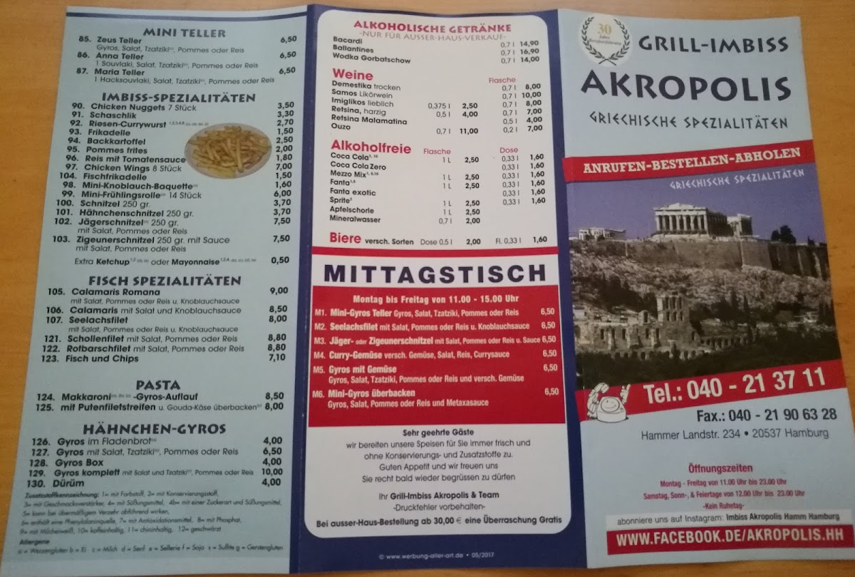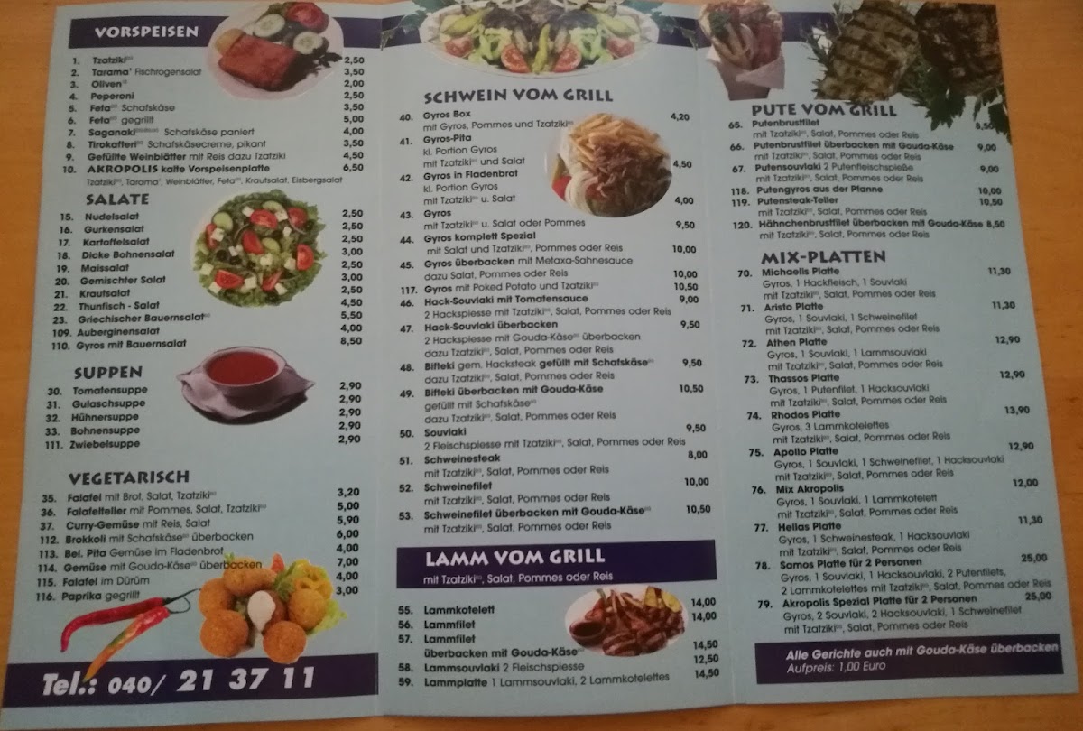 The Restaurant Akropolis Menu offers a delightful journey through traditional Greek cuisine, bringing the rich flavors of the Mediterranean right to the heart of Hamburg. Located on Hammer Landstraße 234, 20537 Hamburg, Germany, this cozy spot invites you to enjoy a variety of dishes made with fresh, high-quality ingredients. Whether you’re in the mood for a juicy souvlaki, flavorful moussaka, or a refreshing Greek salad, there’s something for everyone here. The menu also features a tempting selection of seafood and grilled meats, all perfectly seasoned with aromatic herbs and spices. Each dish is crafted to give you an authentic taste of Greece, with portions that are both satisfying and comforting. Whether you’re visiting for a casual lunch or a relaxed dinner with friends, the menu at Restaurant Akropolis ensures a memorable dining experience with every bite.